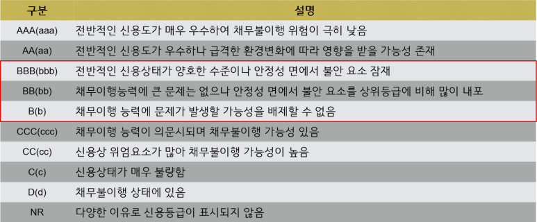 - 어떤 등급이 있나요?: 일반적으로 AAA부터 D까지 여러 단계로 나뉘며, 숫자가 낮을수록(예: A+, A0, A- → BBB+, BBB0, BBB- → BB+, BB0, BB- 등) 등급이 좋고, 높을수록(C, D 등) 신용 위험이 크다는 의미입니다. 보통 BBB 이상이면 비교적 우량한 기업으로 평가받습니다.